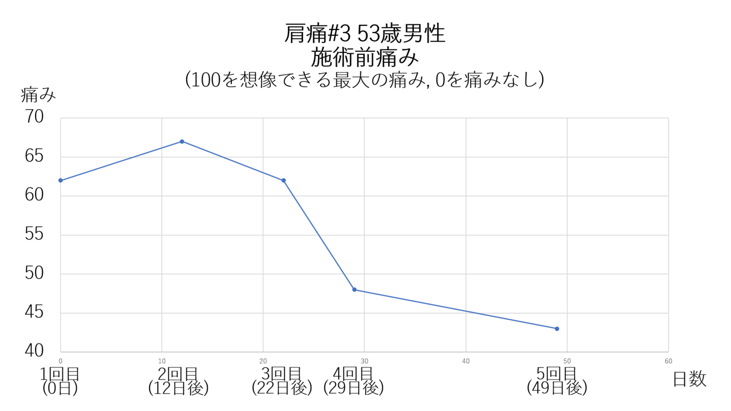 「随分良くなりました。良くなった分、右指の痺れが強く感じる。痺れは常日頃あって仕事してるとけっこう痺れる。右手の親指と人差し指、中指もビリビリ感じる。左肩こりを感じるようになった。最初痛かった場所がここ(右肩全面)からここ(右肘)に移動した。」